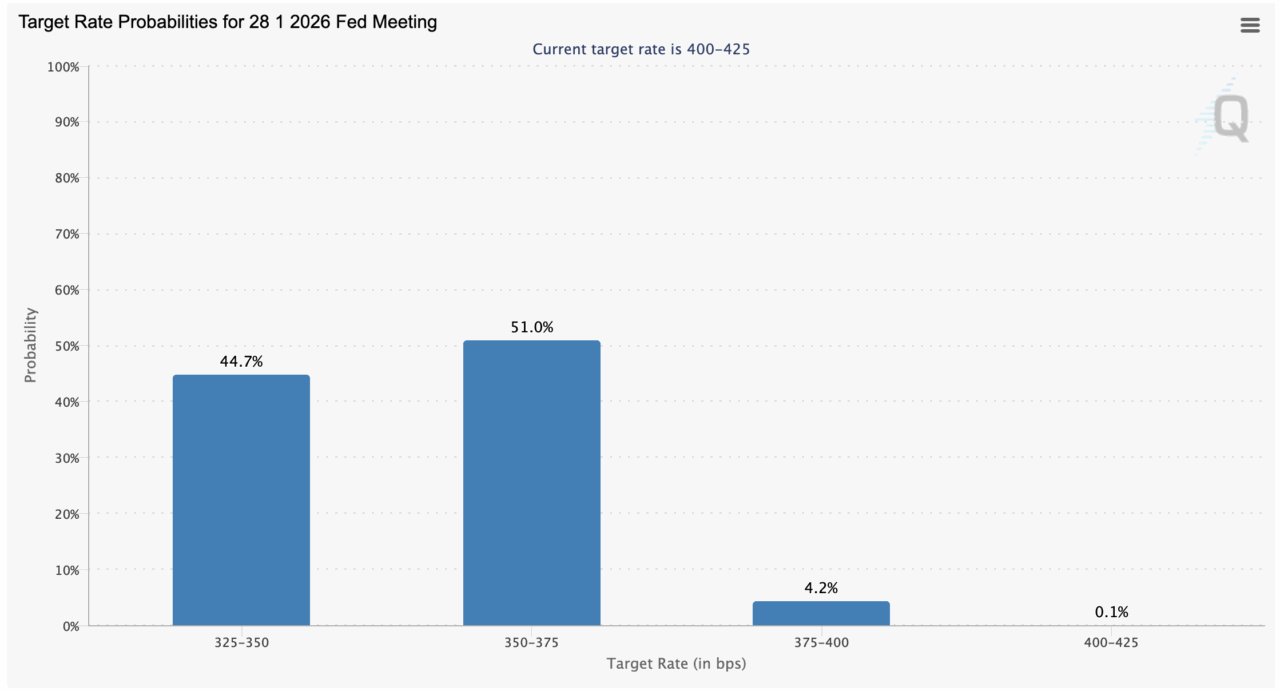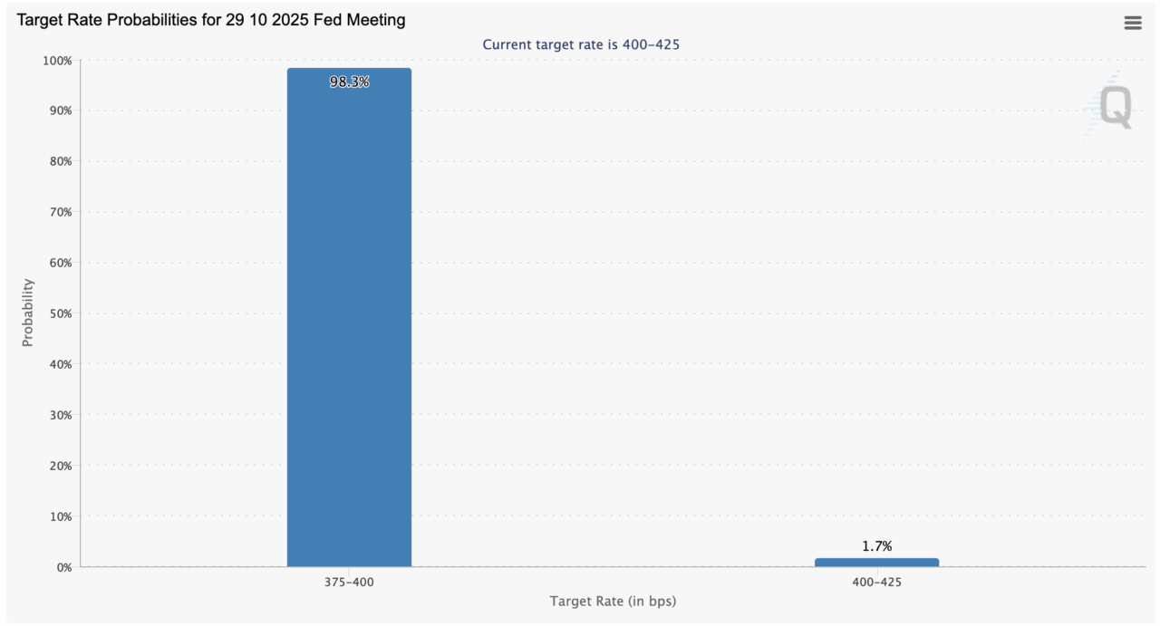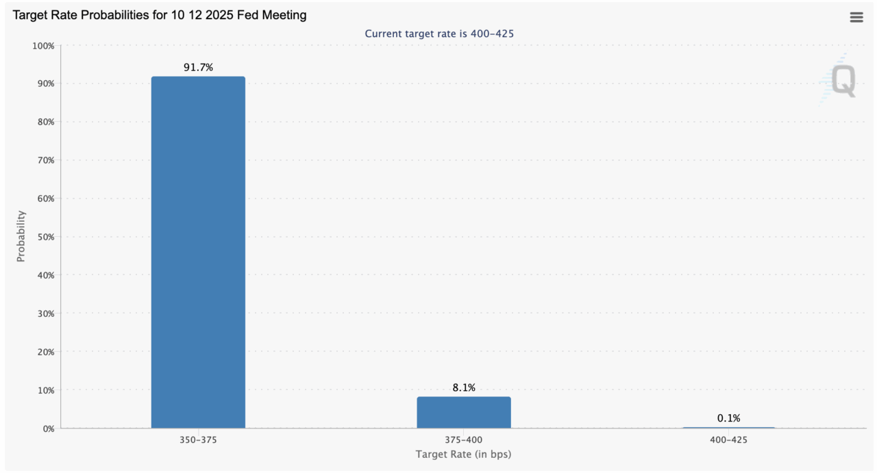 CMEのFedWatchツールによると、次回10月のFOMCでは0.25%の利下げ予想が98.3%と先週の96.2%から高い確率を維持しており、確実視されています。また、12月の連続利下げ予想も91.7%と高い確率になっています。