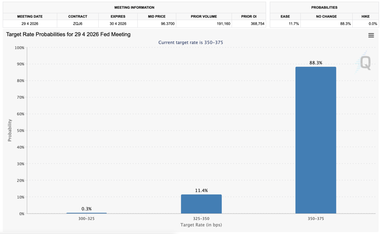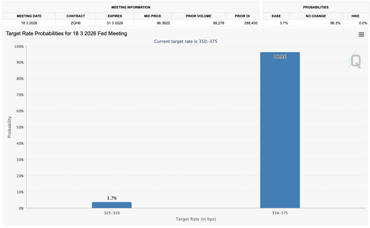 CMEのFedWatchツールによると、次回3月のFOMCは据え置き予想が96.3%と確実視されているようです。また、次々回4月のFOMCでの据え置き予想も75.4%から88.3%に大きく上昇しており、こちらも据え置きとの見方が確実視されているのようですね。